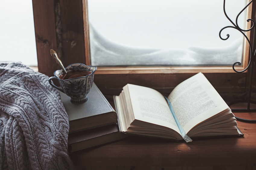 Warm and comfy winter concept. Book, cup of lemon tea and sweater on wooden window sill in old house. Reading and relaxing in cold snowy weather at home. Quiet silent homely scene.