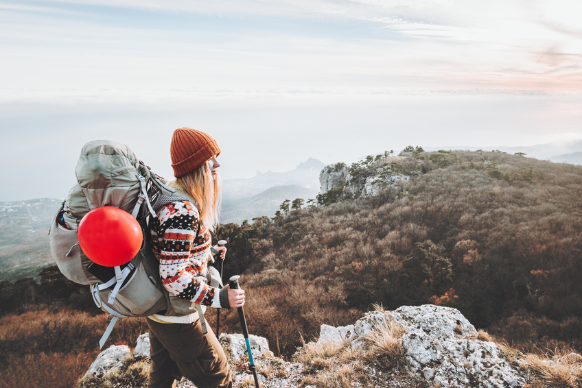 Woman Traveler with backpack mountaineering Travel Lifestyle success concept adventure active vacations outdoor hiking sport